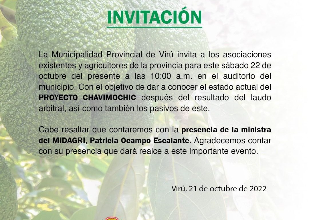 Patricia Ocampo Escalante da la cara ante los pequeños agricultores de los valles de Chicama, Chao, Virú y Moche. Sábado 22 de octubre 10:00 AM, Municipalidad Provincial de Virú. Estamos todos invitados a participar, en particular los pequeños agricultores, delegados del Sindicato Único del PECH (Sutpech Chavimochic), e interesados en saber la verdad sobre el Laudo Arbitral a favor del Perú contra la demanda de Odebrecht.